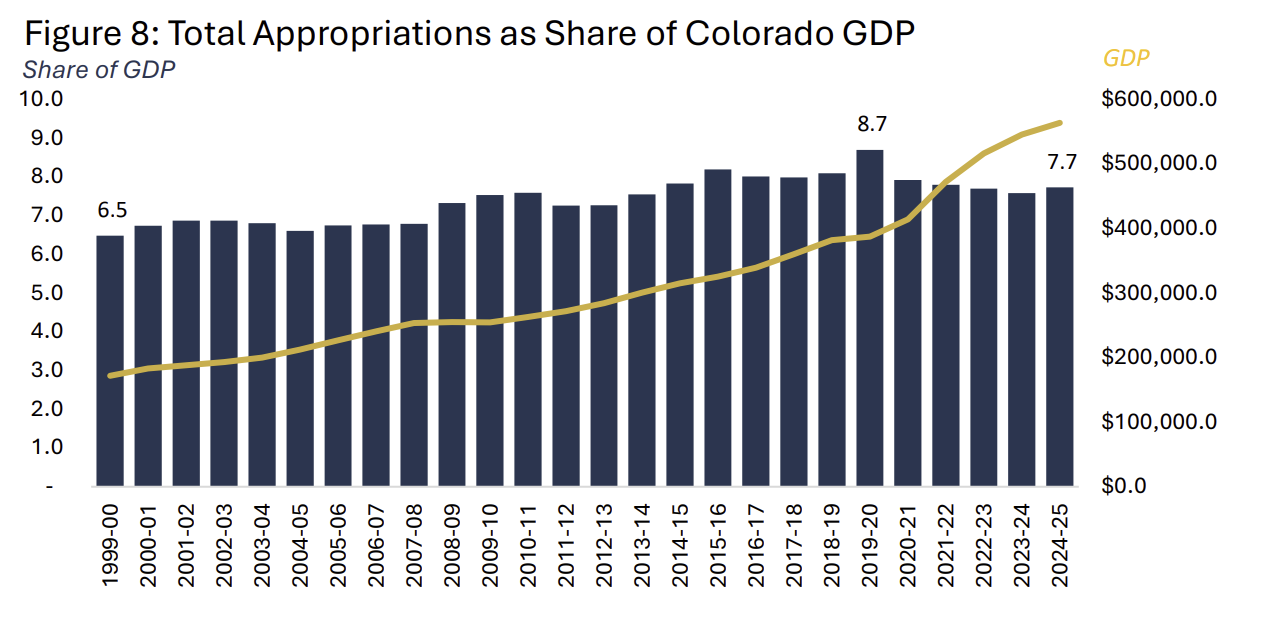 State spending in comparison to the state’s GDP – In fiscal year 2000, total state appropriations were 6.5% of GPD and 7.7% in the past fiscal year. The 25-year average is 7.4%.