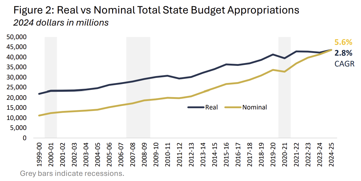 Total state budget appropriations have grown at a compound average growth rate of 5.6% since FY 1999-2000 on a nominal basis, which drops to 2.8% when adjusted for inflation. With the rise in inflation during the early 2020s, state appropriations have leveled off in real terms after FY 2021-22.