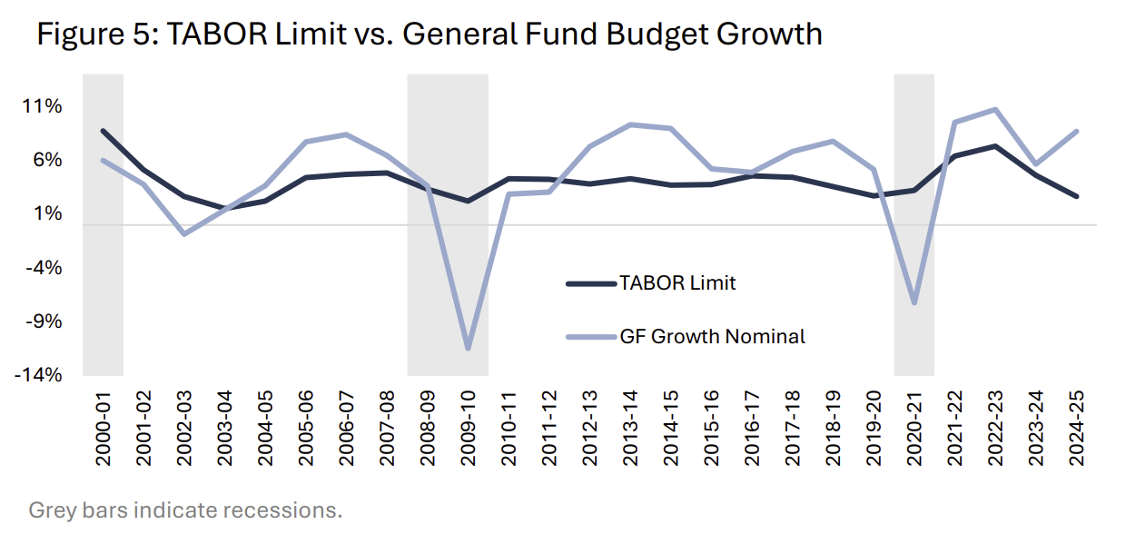Rate of growth in Colorado’s budget – Total appropriations grew at an average inflation-adjusted rate of 2.8% from FY1999-00 through FY 2024-25, while General Fund appropriations grew by 1.8%. When not adjusted for inflation, total appropriation growth averaged 5.6%, while General Fund appropriations averaged 4.6%.
