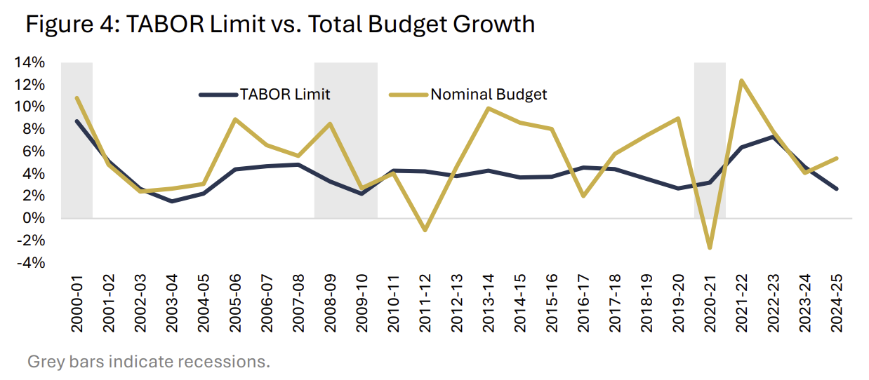 As total appropriations include TABOR-exempt sources, total appropriations not adjusted for inflation are typically higher than the TABOR limit, as seen in Figure 3. Additionally, cash fund and federal fund revenues are typically less reactionary to economic activity and economic downturns than General Fund revenues, so the declines in revenue are more lagged and less severe for total appropriations.