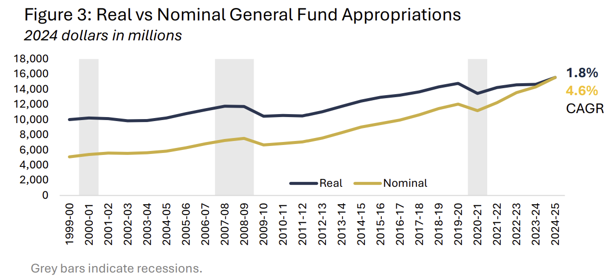 Total General Fund appropriations is similar to that of total appropriations, but with more muted growth. Over the past 25 fiscal years, annual General Fund appropriations grew by 1.8% when adjusted for inflation and 4.6% when not adjusted.