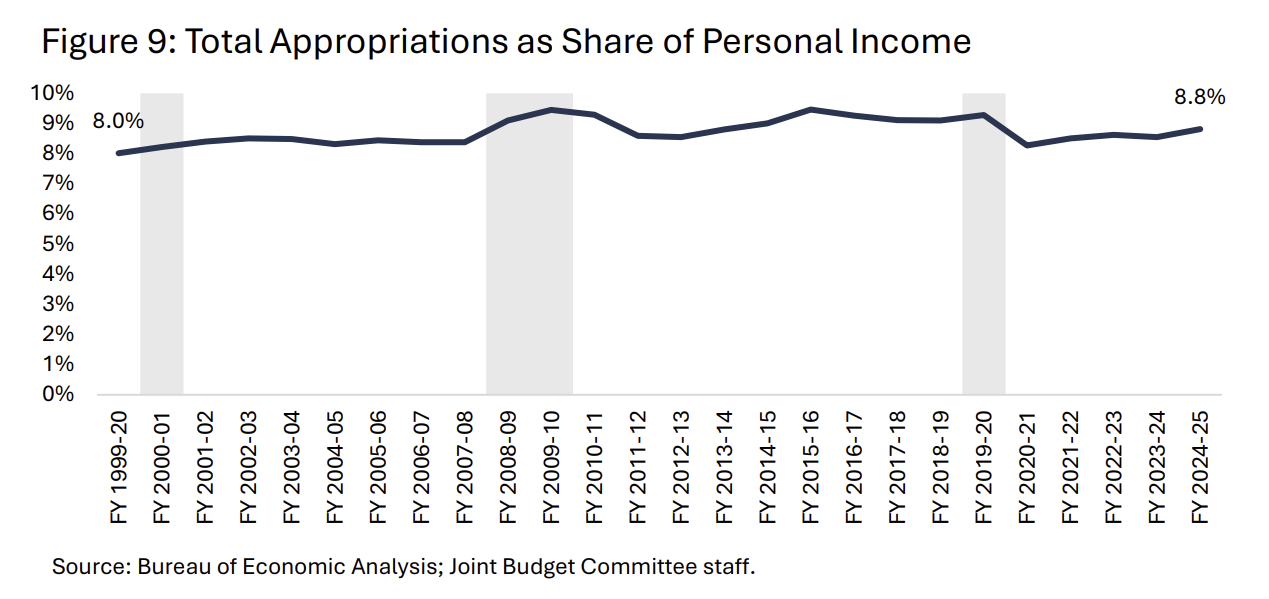 Another comparative metric is personal income, which includes wages and salaries; proprietor’s income; dividends, interest, and rents; and transfer payments from the government (Social Security, unemployment, etc.). Total appropriations as a share of personal income shows a similar pattern to GDP. Over 25 years, the current share is 8.8% and the average share is 8.4%