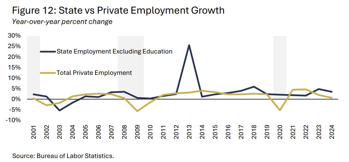 State government employment outside the education sector expanded by 3.5% in 2024 and has continued to rise, increasing an unadjusted 2.7% through August 2025. With a hiring freeze in place and tight budget conditions, that pace is expected to hold, leaving 2025 employment growth at roughly 2.7%. Looking ahead, staffing levels are projected to tick up by just 0.4% in 2026, reflecting limited funding for new positions across both fiscal years. When revenues tighten, state leaders tend to avoid direct personnel cuts, opting instead to trim broad programmatic spending or reduce grant funding.