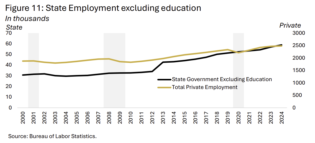 Notably, Colorado’s state workforce has not posted a single year of decline since the 2008 recession. From 2008 to 2024, state government employment grew at a compound annual rate of 3.8%—more than double the 1.5% average annual pace of overall statewide job growth.