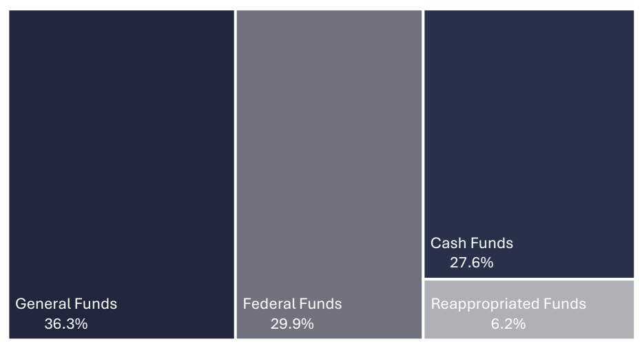 State expenditure and employment is largely a function of the revenue collected by the state government. The state collects funds from taxes, fees, and the federal government allocations. For state fiscal year 2025-26, which runs from July 1, 2025, through June 30, 2026, state appropriations of all funds total $46.7 billion. The breakdown of state funds by source is shown in the chart below.