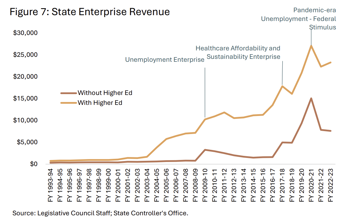 One reason for the shift in Transportation funding is the increasing use of state enterprises. State enterprises in Colorado are government-owned entities legally separated from the state’s TABOR revenue limits because they receive less than 10% of their funding from state or local tax revenues. Examples include the Unemployment Insurance Enterprise, the Healthcare Affordability and Sustainability Enterprise, and various higher-education enterprises. The chart below illustrates the rapid growth of Colorado’s state enterprise revenue over the past three decades, especially after the mid-2000s. TABOR is the primary reason for the use and proliferation of state enterprises. There was relatively modest enterprise revenue through the early 2000s, followed by sharp increases tied to the creation of new enterprises and federal interventions—most prominently during the Great Recession and the COVID-19 pandemic. The inclusion of higher-education enterprises dramatically increases total enterprise revenue, underscoring how enterprise designation has become a key fiscal tool for managing large, fee-supported programs outside TABOR constraints.