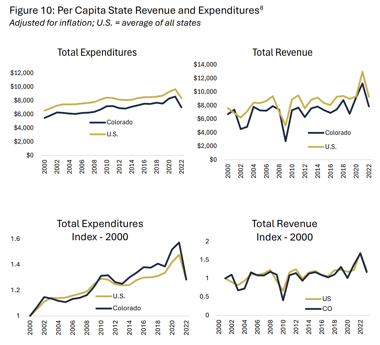 The same dataset can be compared over time for Colorado and the total state average for the U.S., as shown in the charts in Figure 8. Average U.S. per capita revenue and expenditures were consistently higher than Colorado expenditures from 2000 to 2022. Once the data is indexed to 2000 to see how revenue and expenditures change over time relative to the level in 2000, expenditure growth in Colorado outpaced U.S. spending, while revenue remained mostly on par with U.S. averages.